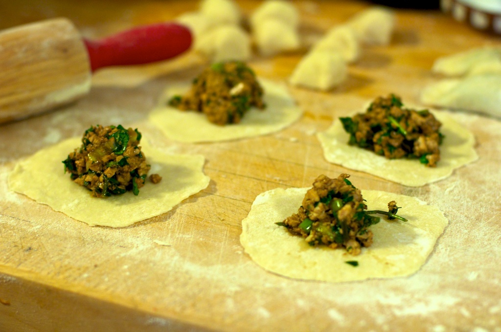 1. Use a teaspoon to scoop a heaping amount of filling onto the middle of a wrapper. Fold over and pinch edges. Put aside. Repeat.
