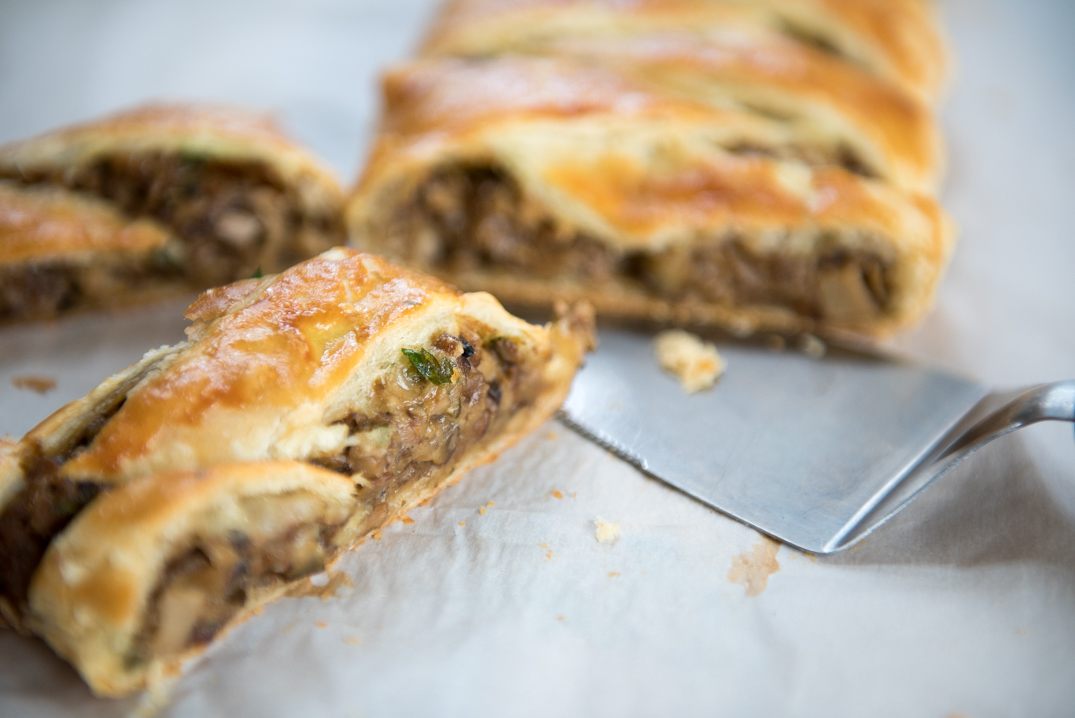 I've never made a strudel before. For this reason I kept things simple and bought frozen puff pastry from the store. You're welcome to make your own. A couple notes: braiding the puff pastry makes for an attractive presentation and allows air to escape through the vents so that the strudel doesn't blow up into a monstrosity. Dried porcini, though not mandatory, gives the strudel a deep mushroomy flavor. You need less of the mushroom mixture than you think. My next strudel will have a bit less than the one pictured here.