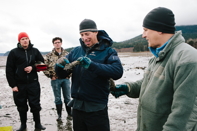 My co-leader, John Adams, manages Taylor Shellfish's Dosewallips facility. As a third-generation shellfish farmer, he also has his own family business, Sound Fresh Clams & Oysters, where he's been making a name all over the Pacific Northwest and beyond for his Skookum Point oysters. Recently a writer from Bon Appetit dropped by to sample John's stuff.