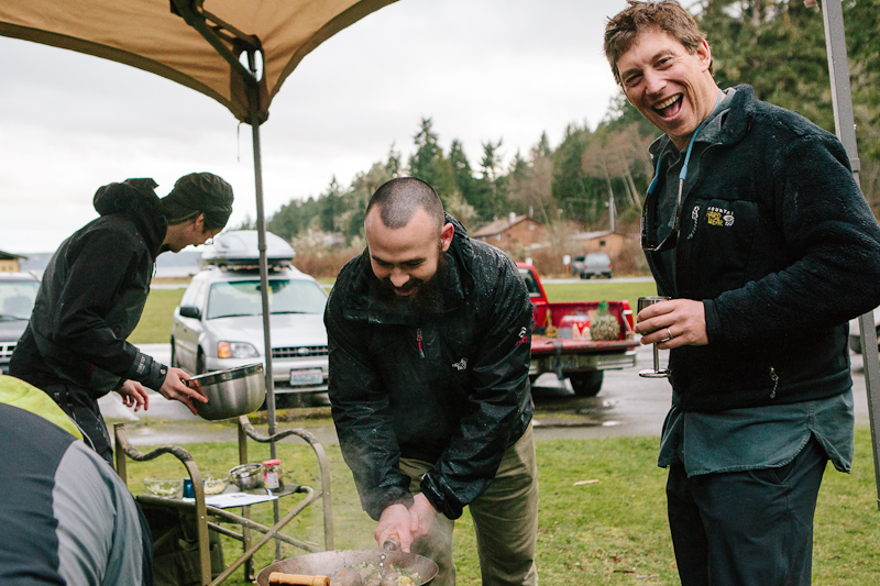 My shellfish classes, in particular, have escalated (perhaps as word has gotten out and each subsequent class is intent on besting the previous one) into veritable bacchanals. There's something about working up a sweat on the tide flats and then whumping together a feast over campstoves that encourages plenitude: folks show up with champagne, beer, cheese, salumi, cookies, and other treats. We've had basement apple wine, home-cured sausage, and empanadas. There's almost always a fillet or two of smoked salmon and recently someone brought bento boxes packed full of potstickers, barbecued pork, and candied almonds.