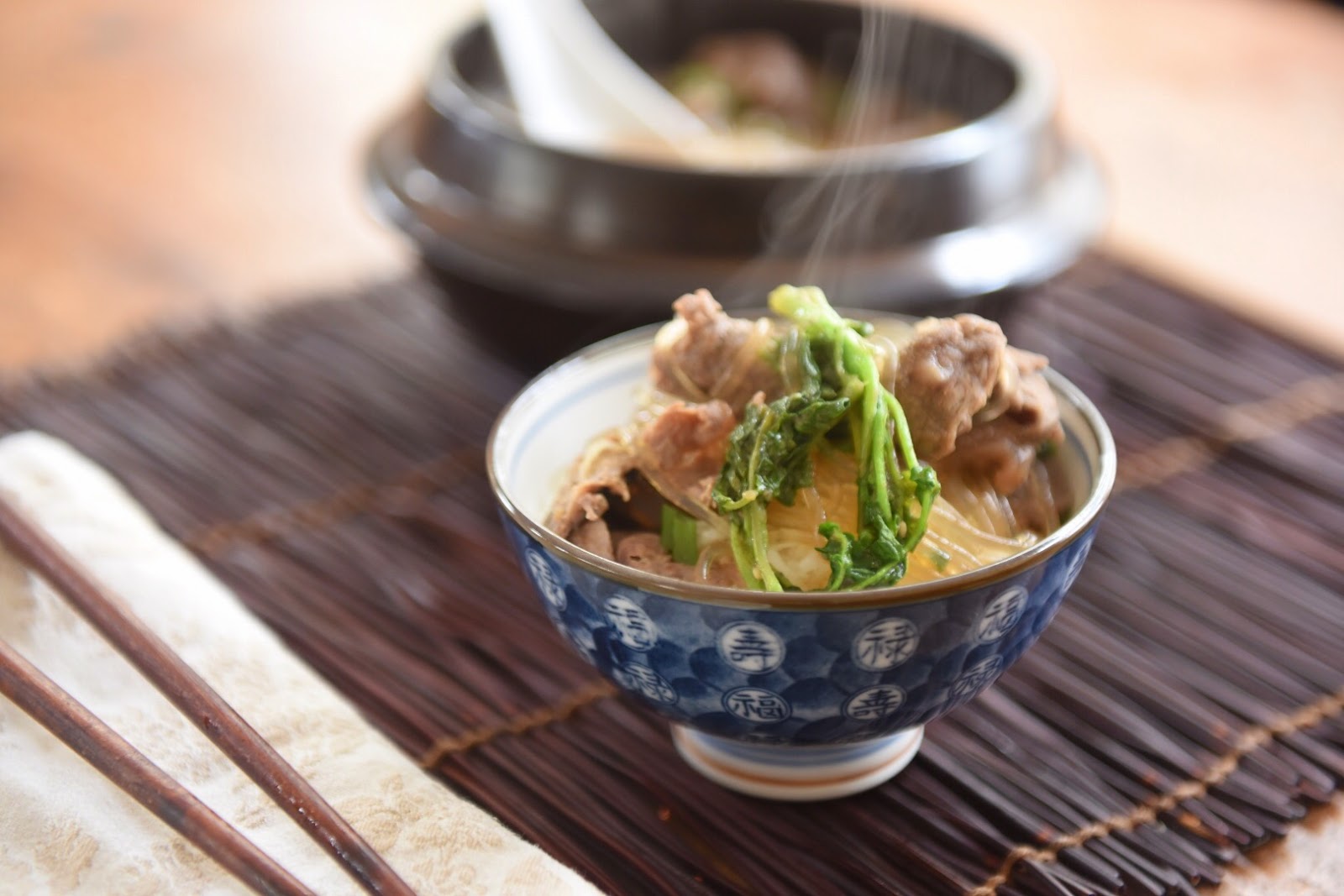 A typical clay pot bulgogi will have some sort of leafy green vegetable such as spinach stirred in at the end; this one owes its vibrant color to the wild and very nutritious watercress that's leafing out across much of the country right now.